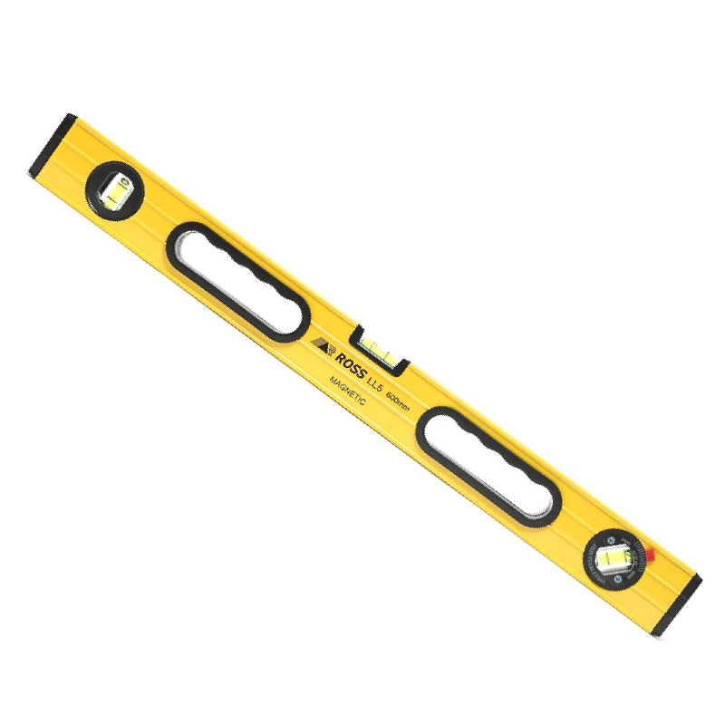 Builders magnetic level heavy duty box section with hand holes and plumb, horizontal and angle vial. Magnetic base for use on steel structures.